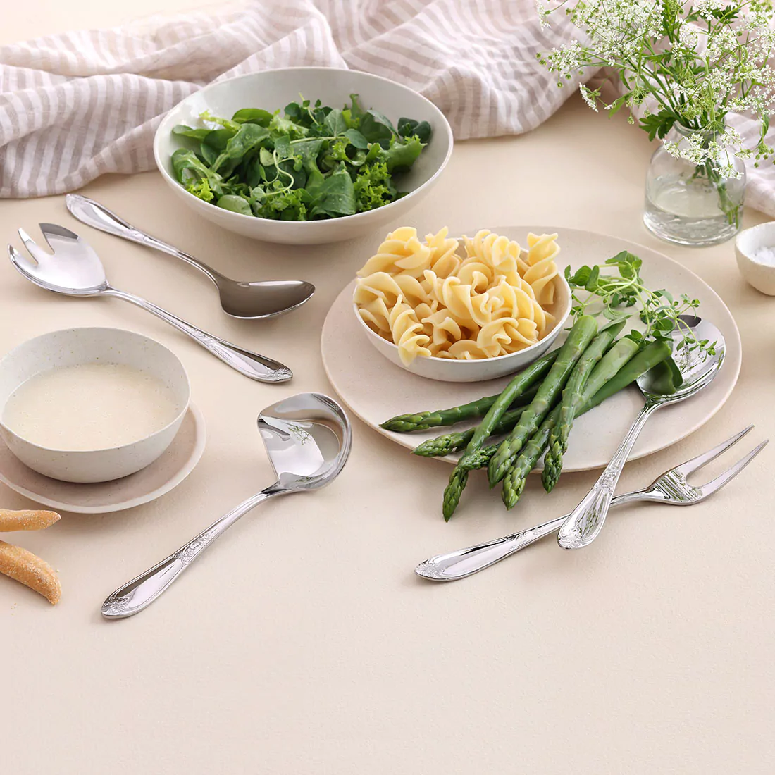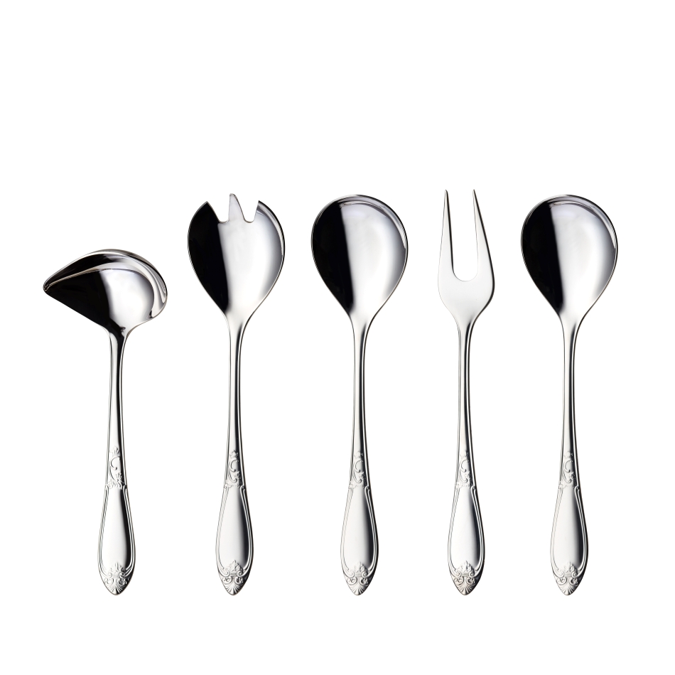 Nina serveringsset 5 delar – Hardanger Bestikk. Rokokoinspirerat mönster i hållbart 18/10‑stål. Ger romantisk elegans till dukningen.