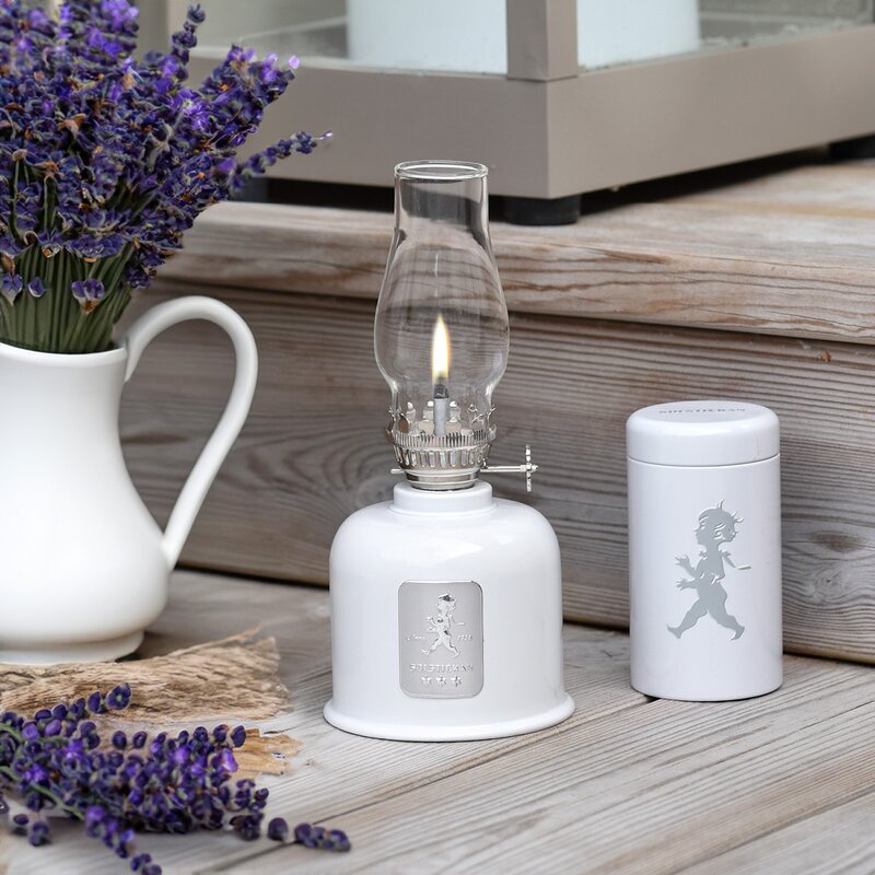 Solstickan fotogenlampa i vit/silver färg är en elegant och funktionell ljuskälla med tidlös design och det klassiska Solstickepojken-emblemet. Den kombinerar traditionellt formspråk med praktisk användning och passar lika bra som stämningsfull belysning som vid behov av reservljus.