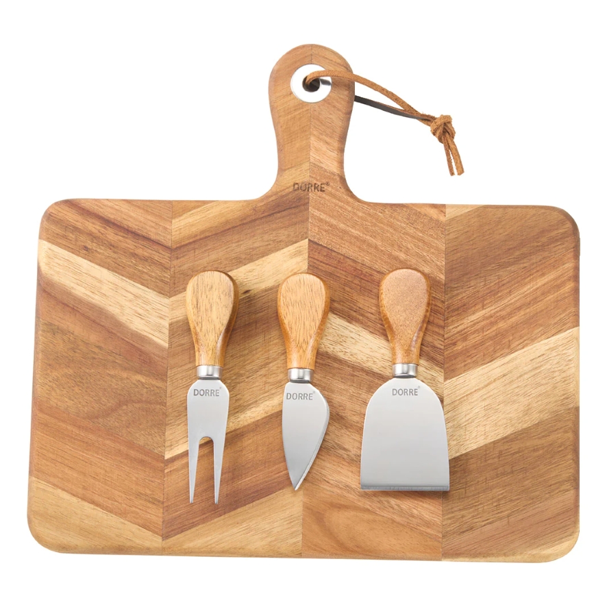 Elegant serveringsbricka i akaciaträ med vackert mönster och tre praktiska ostverktyg i rostfritt stål.