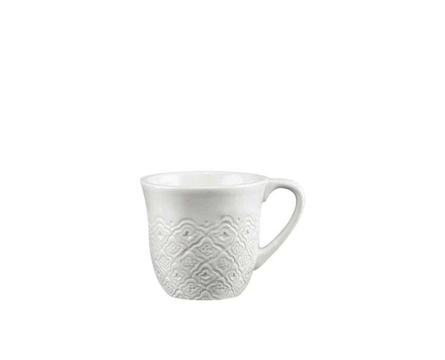 Stadig mugg från Orientservisen med handgjort reliefmönster. Tål diskmaskin och mikrovågsugn. Ger en vacker och unik dukning varje gång.