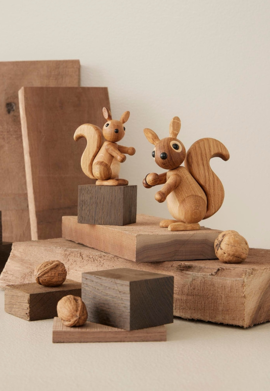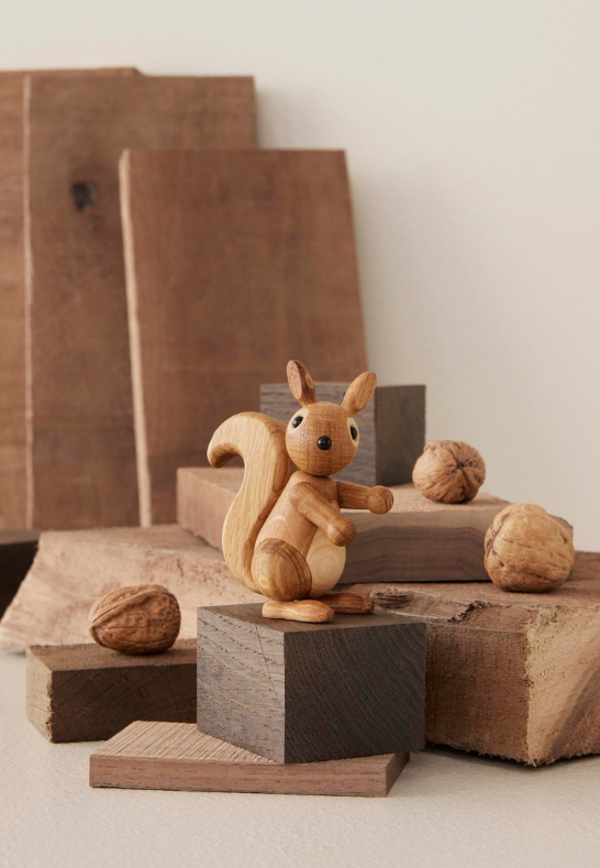 Peanut är en charmig träfigur föreställande en ekorrunge i FSC-certifierad ek och lönn. En dekorativ designfigur för nordisk inredning.