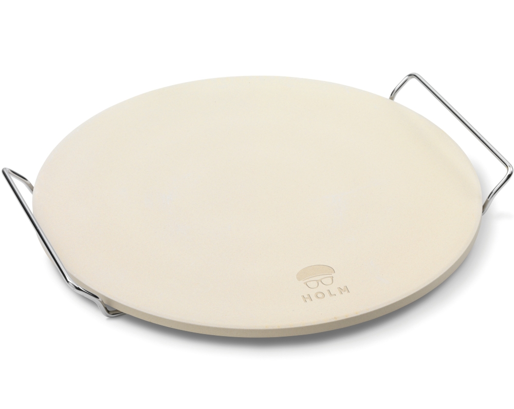Pizzasten 33 cm för perfekt pizzabotten. Används i vanlig ugn och på grill. Medföljer smart förkromad hållare för enkel servering.