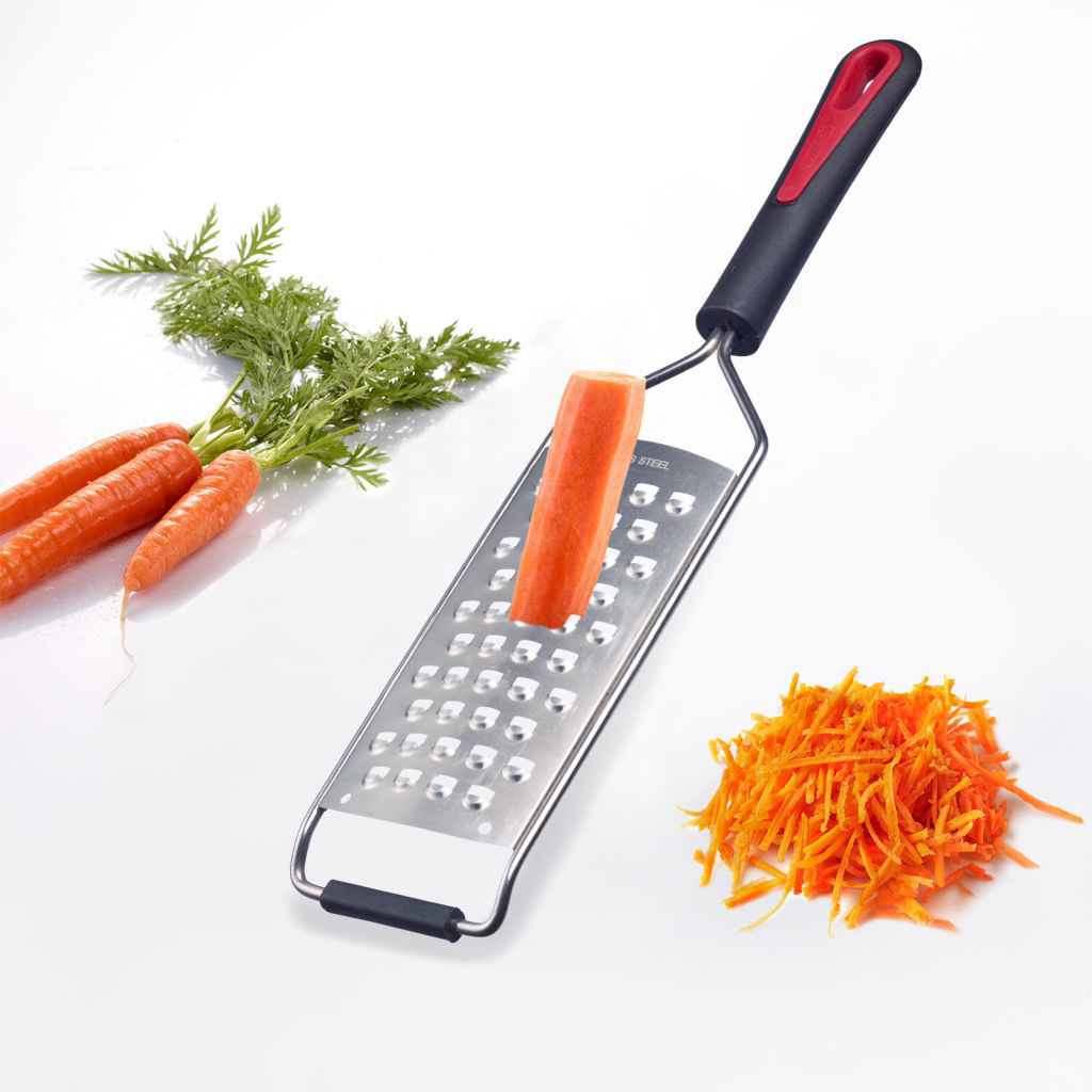 Den hygieniska konstruktionen innebär att den funktionella delen är infäst i handtaget utan håligheter där smuts kan samlas. Rivjärnet har ett halkfritt grepp i änden för stabil användning samt ett medföljande bladskydd som gör förvaringen säker i kökslådan. Efter användning rengörs det enkelt i diskmaskin.