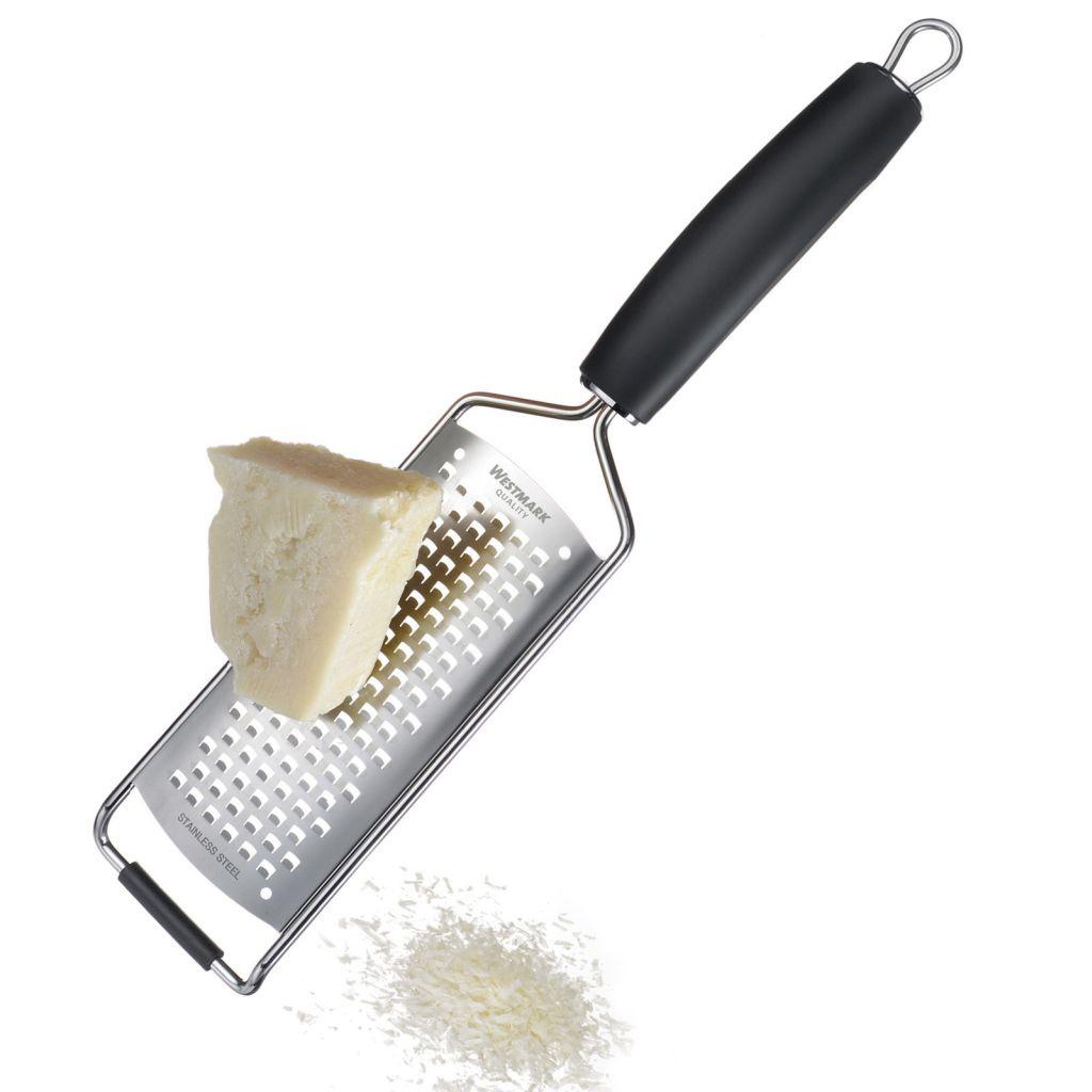 Passar för parmesanost, ost, choklad, lök, kål och frukt. Halkskydd i foten och gummihandtag gör rivjärnet säkert. Bladskydd medföljer för säker förvaring.