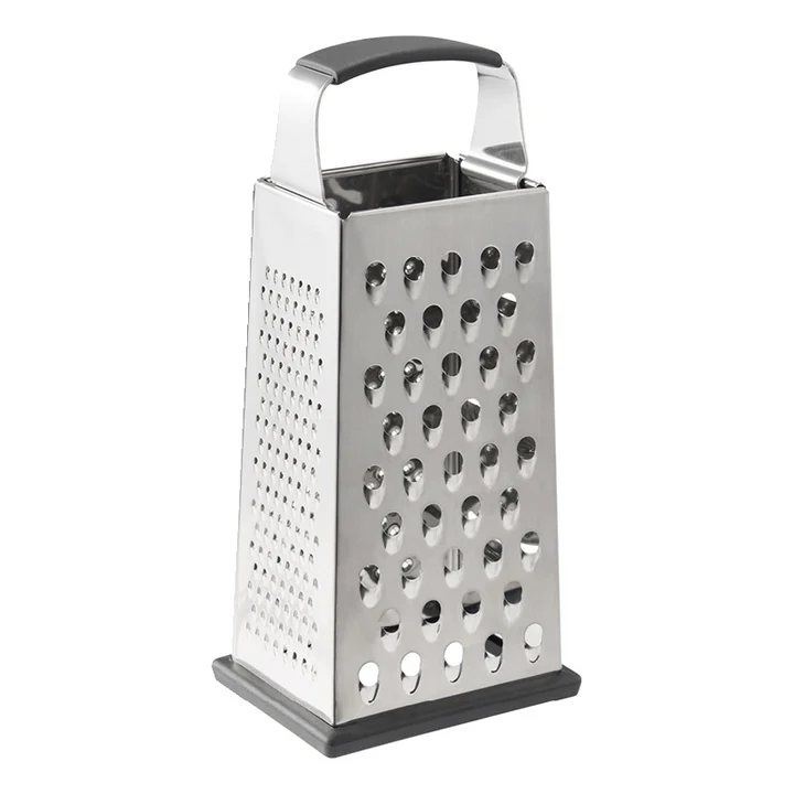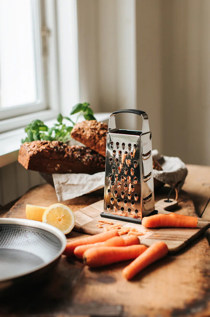 Praktiskt fyrsidigt rivjärn med olika rivytor för ost, grönsaker och rotfrukter. Utrustat med gummifötter som ger stabilitet på bänken och ett bekvämt handtag för säkert grepp.
