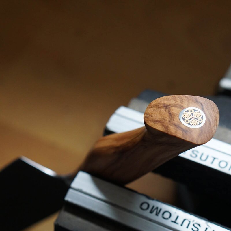 Handtaget är tillverkat av franskt olivträ med detaljer i mässing – ett naturligt, ergonomiskt och visuellt exklusivt material som ger perfekt balans och en varm känsla i handen. Santokuformen gör kniven idealisk för grönsaker, fisk och kött med exakta, kontrollerade snitt.