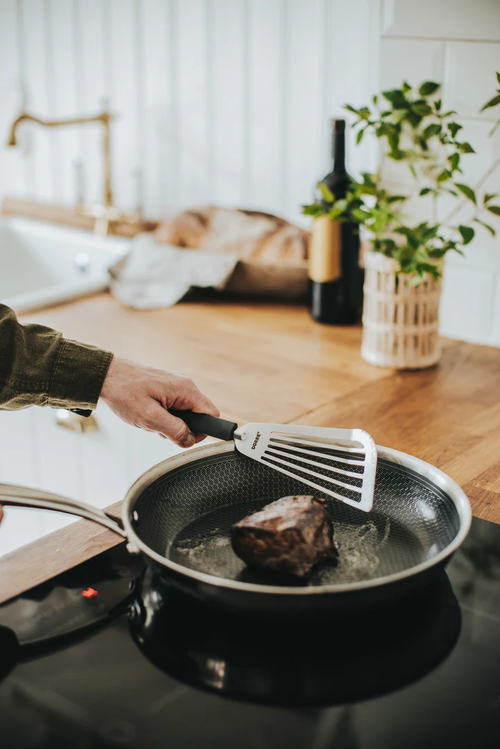 Denna stekspade på 33 cm kombinerar funktion och skonsam hantering. Den silikonbelagda spetsen skyddar dina non-stick-pannor och känsliga kokkärl från repor, samtidigt som den ger en effektiv och smidig användning. Perfekt för att vända pannkakor, omeletter eller delikata rätter som fisk och grönsaker. Med sin längd på 33 cm är den idealisk för både matlagning och servering. Det ergonomiska handtaget ger ett bekvämt grepp, vilket gör den enkel att använda även under långa sessioner i köket.