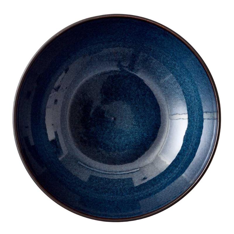 Skålen är tillverkad i robust stengods och har en karakteristisk design där den matta svarta utsidan möter en djup, glänsande mörkblå Den reaktiva glasyren skapar levande nyanser och gör varje skål unik med naturliga variationer i färg och struktur.