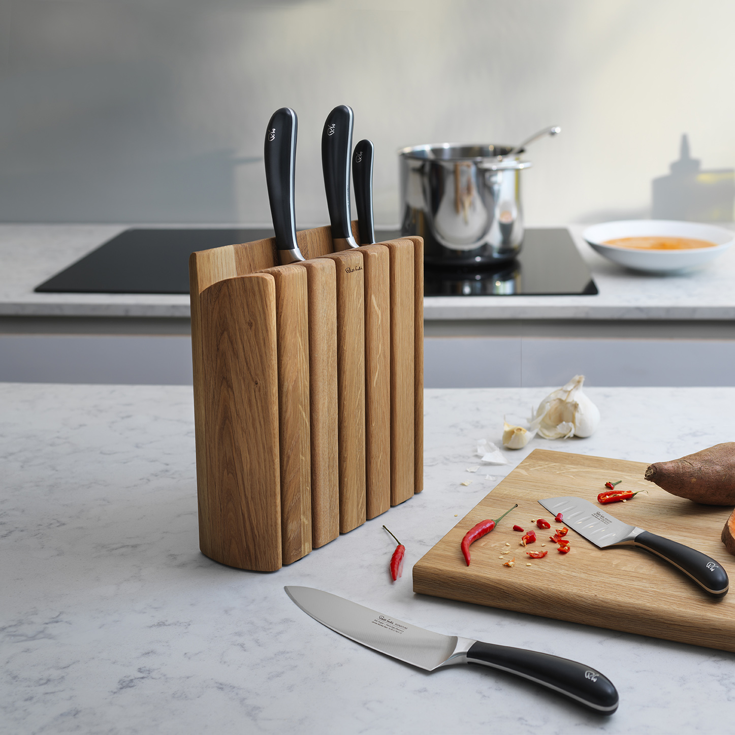 Knivblock i massiv ek i Signature serien. Idealisk att ställa mot en vägg för att spara dyrbar plats i köket.