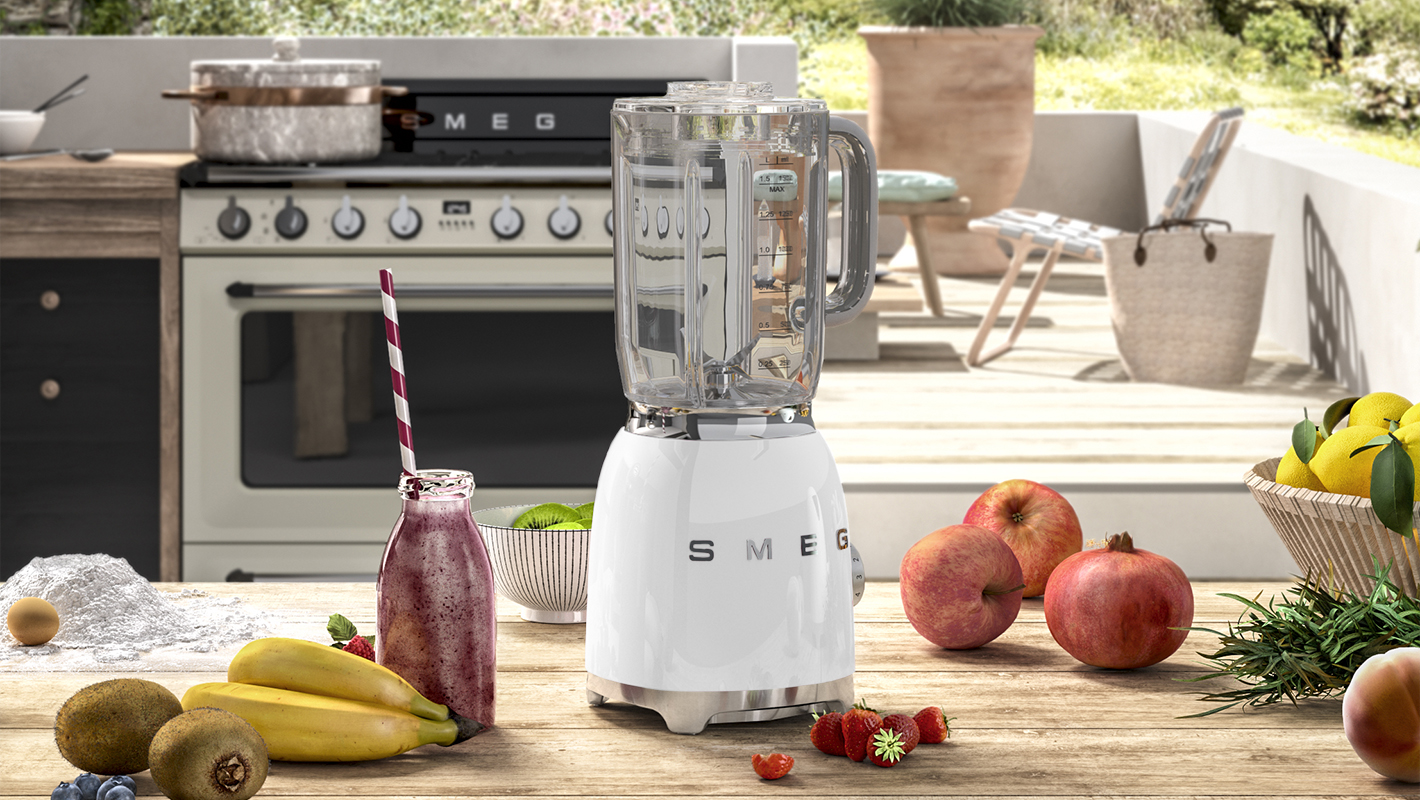 Vit blender i retrodesign från Smeg kraftfull och stilren för smoothies med mera.