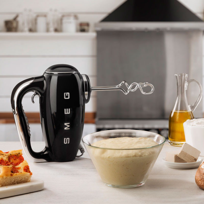 Smeg Elvisp HMF01 är en kraftfull elvisp i ikonisk 50’s Style-design från Italien. Med nio hastigheter och en extra Turbo-funktion kan du enkelt vispa allt från grädde och pannkakssmet till bröd- och pizzadeg. Den upplysta LED-displayen visar både hastighet och tid, och tack vare mjukstartsfunktionen slipper du stänk när du börjar vispa.