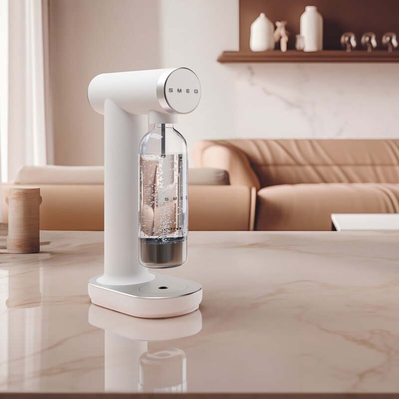 Smeg kolsyremaskin SKC01WHM i matt vitt kombinerar stilren design med enkel och effektiv kolsyresättning.