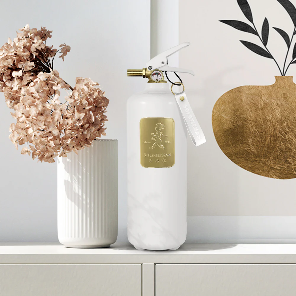 Solstickan 2 kg vit/guld är ett säkert och designmedvetet val för dig som vill ha brandskydd som smälter in i en modern inredning.