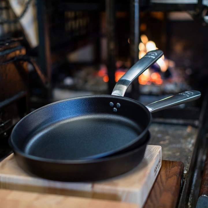 Som alltid med kolstålsprodukter rekommenderar vi en långsam uppvärmning som ger en jämn värme över hela stekytan. Kolstålet håller värmen effektivt och man behöver därför inte använda sig av högsta effekt på spisen. Efter rengöring i hett vatten och en direkt torrtorkning avslutar du med att smörja ett tunt skikt av olja på stekytan. På så vis underhåller du stekpannans yta på ett enkelt sätt och du bygger samtidigt upp en släpp-lätt-effekt.