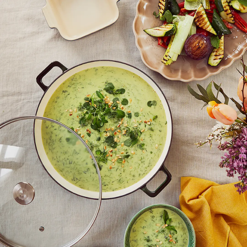 Grytan är tillverkad av emaljerat gjutjärn, ett material som är känt för sin värmehållande förmåga och hållbarhet. Det medföljande glaslocket är värmetåligt och utrustat med en praktisk ångventil som gör matlagningen enkel och kontrollerad.