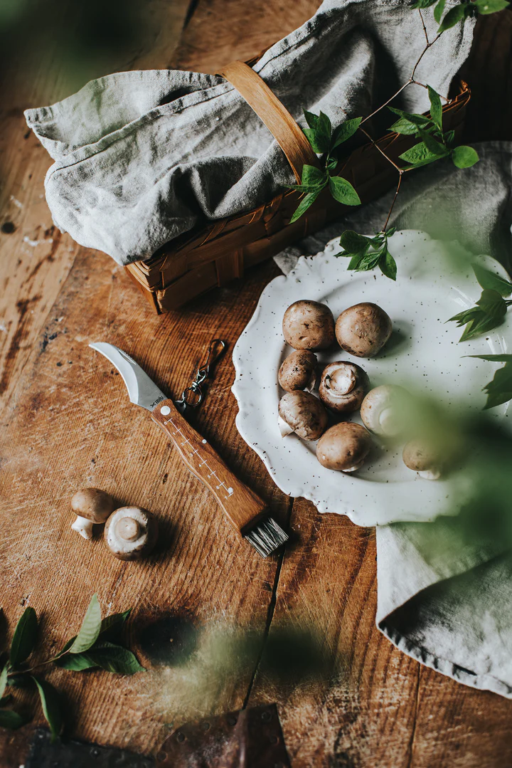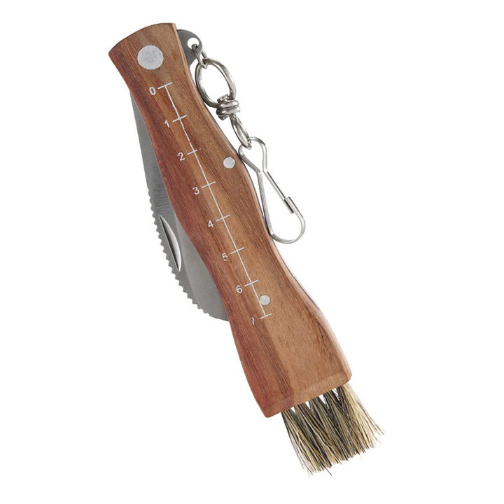 Praktisk svampkniv med fällbart blad, borste för rengöring och måttskala på trähandtaget. Perfekt för svampplockning i skogen.