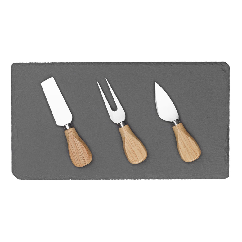 Ostbricka i skiffer med 2 ostknivar och ostgaffel i rostfritt stål och med trähandtag. Mått 30x16 cm – perfekt present till ostälskare.