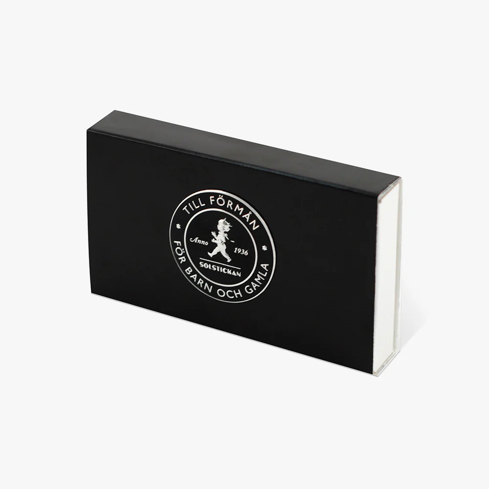 Stilrent tändsticksrör i plåt med avbildning av den klassiska Solstickepojken. Röret innehåller cirka 100 st extra långa svenska kvalitetständstickor tillverkade i Tidaholm av asp från svenska skogar.