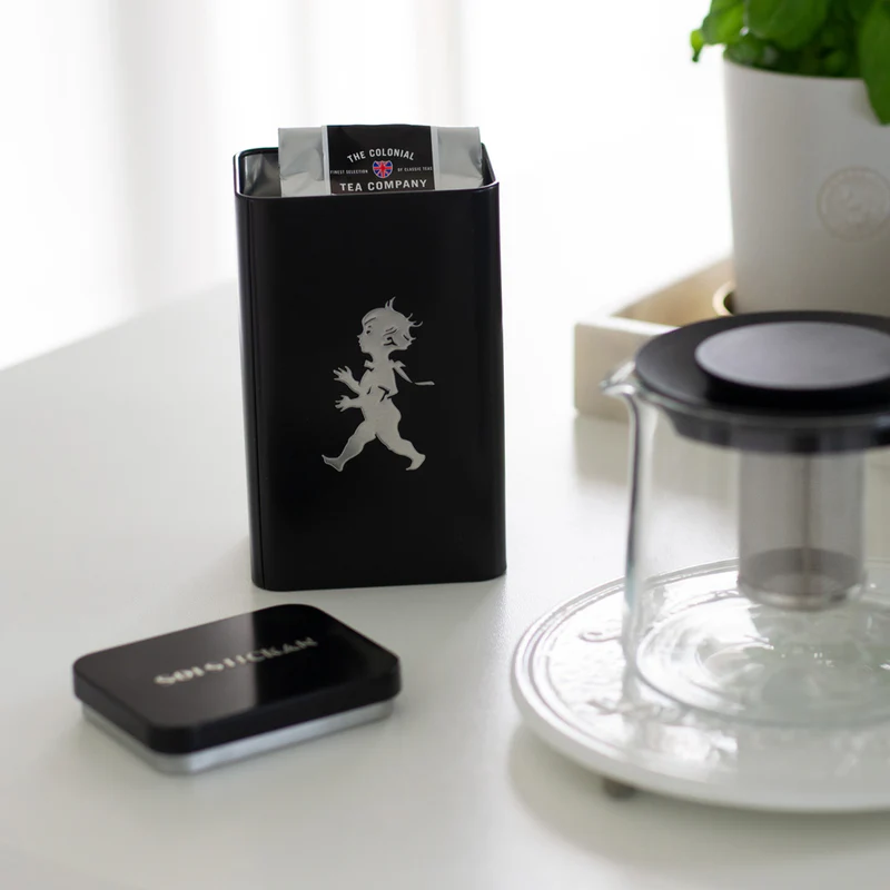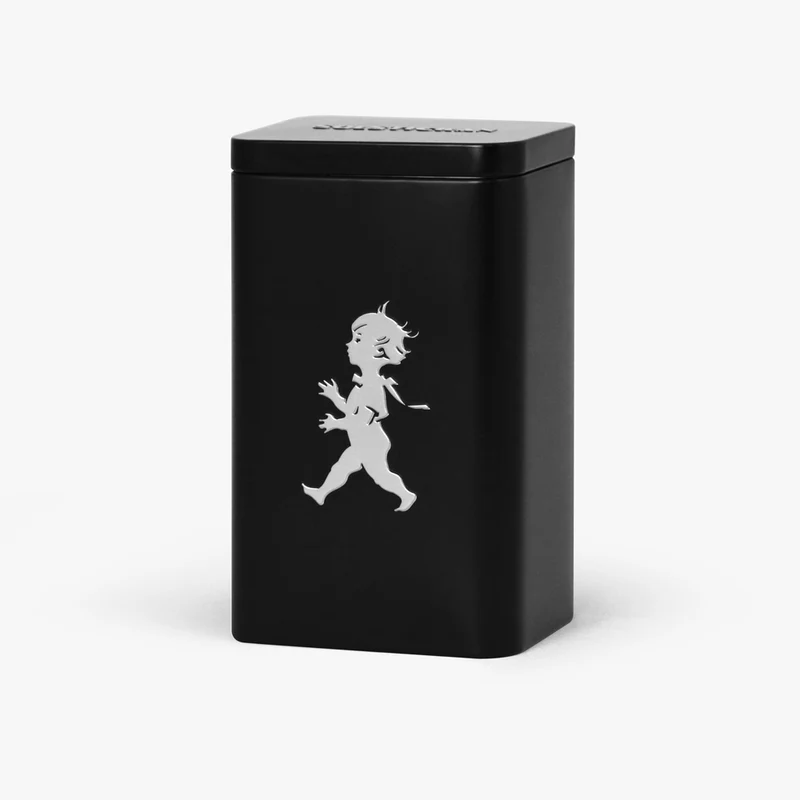 Solstickan teburk i plåt – rymmer löste, tepåsar eller småprylar. Klassiska pojken från 1936 pryder den, fin på köksbänken.