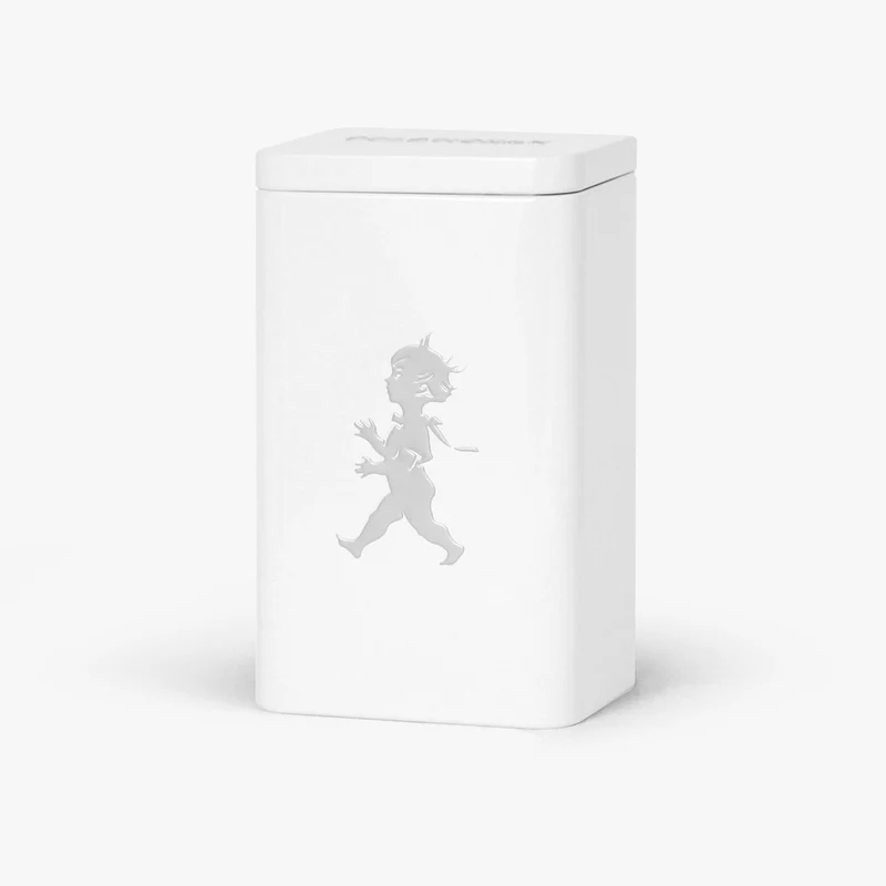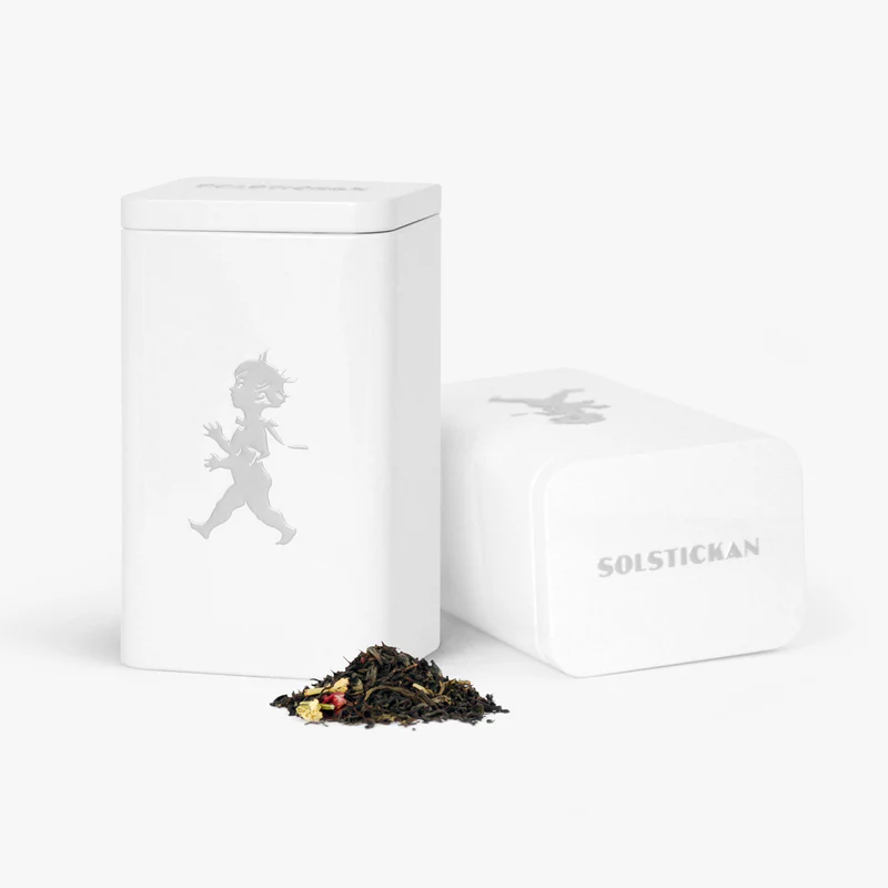 Solstickan teburk i plåt – rymmer löste, tepåsar eller småprylar. Klassiska pojken från 1936 pryder den, fin på köksbänken.