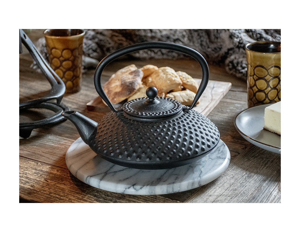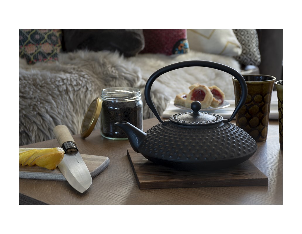 En mycket vacker oval tekanna av gjutjärn som lyser upp tebjudningen med sin form och mönster. Järnet i tekannan renas i samband med gjutningen. Kannans insida är emaljerad vilket skyddar den mot rost och gör den lättdiskad.