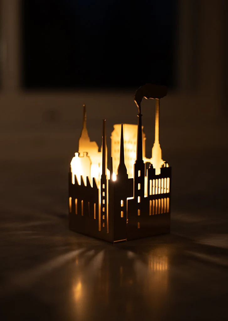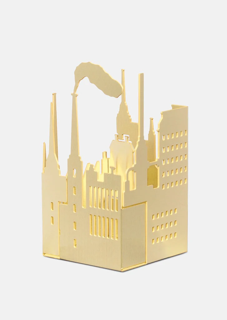 Fabriken - Skultuna är en liten etsad ljushållare för värmeljus, formgiven år 2015. Inspirerad av de gamla fabriksbyggnaderna på Bruket i Skultuna och bränderna som har förstört dem många gånger om. De första byggnaderna byggdes upp i början av 1600-talet, men de nuvarande fabriksbyggnaderna som du kan se idag byggdes om efter en stor brand i slutet av 1800-talet