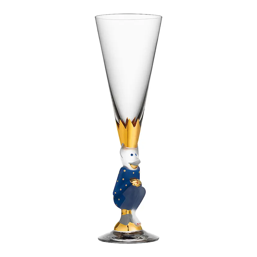 The Sparkling Devil champagneglas – munblåst i Sverige och handmålat med 21 k guld. Gunnar Cyréns skiss väcks till liv i glimrande färger.