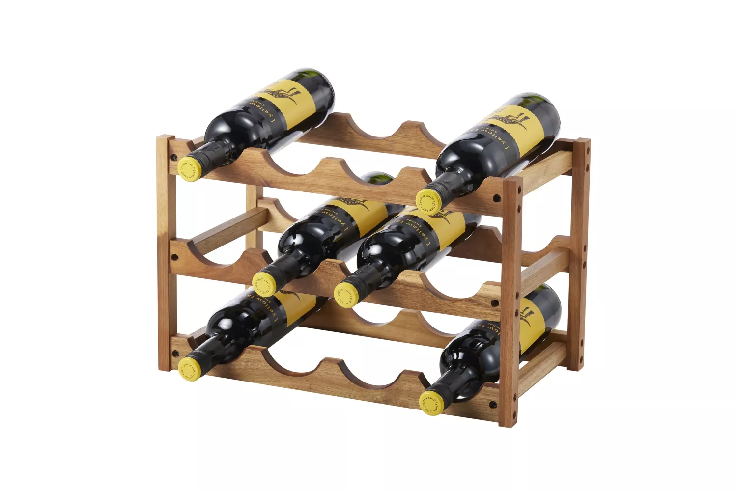 Varo vinställ i akaciaträ, 44,2×28 cm. Rymmer 12 flaskor som ligger stadigt i valvformade fack. Stilfullt för kök eller bar.