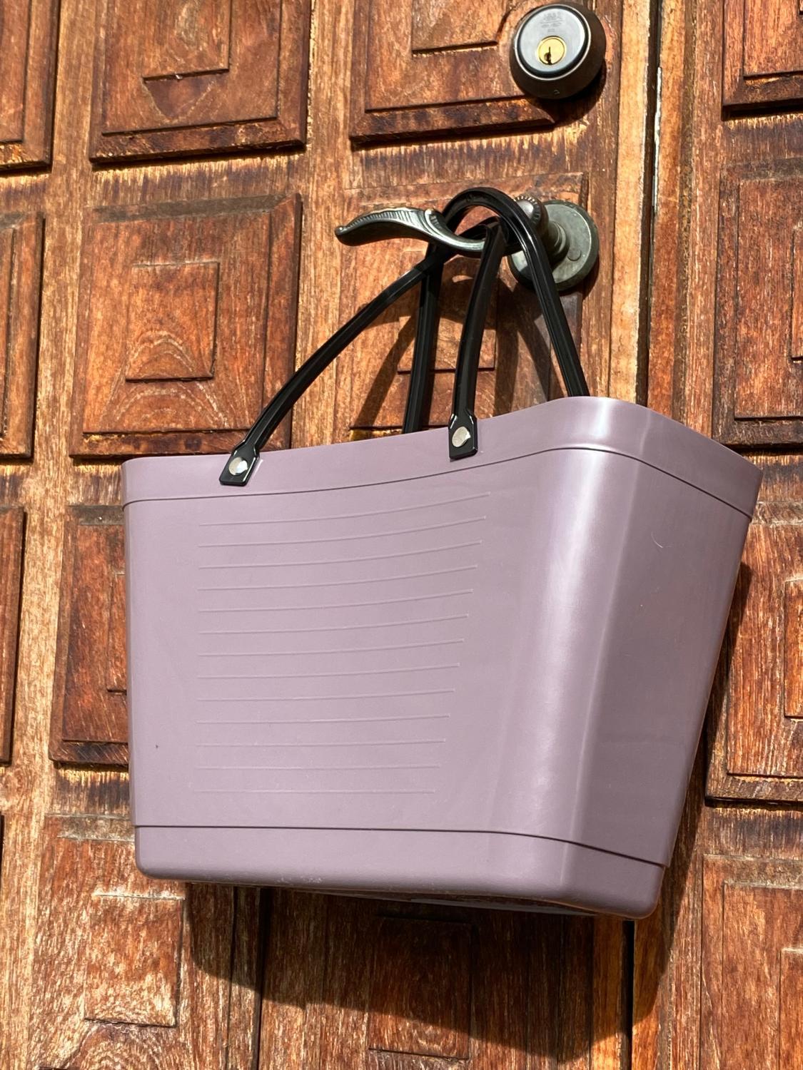 Liten praktisk hinza väska i sockerrörsmaterial och plommonfärg passar till vardags.