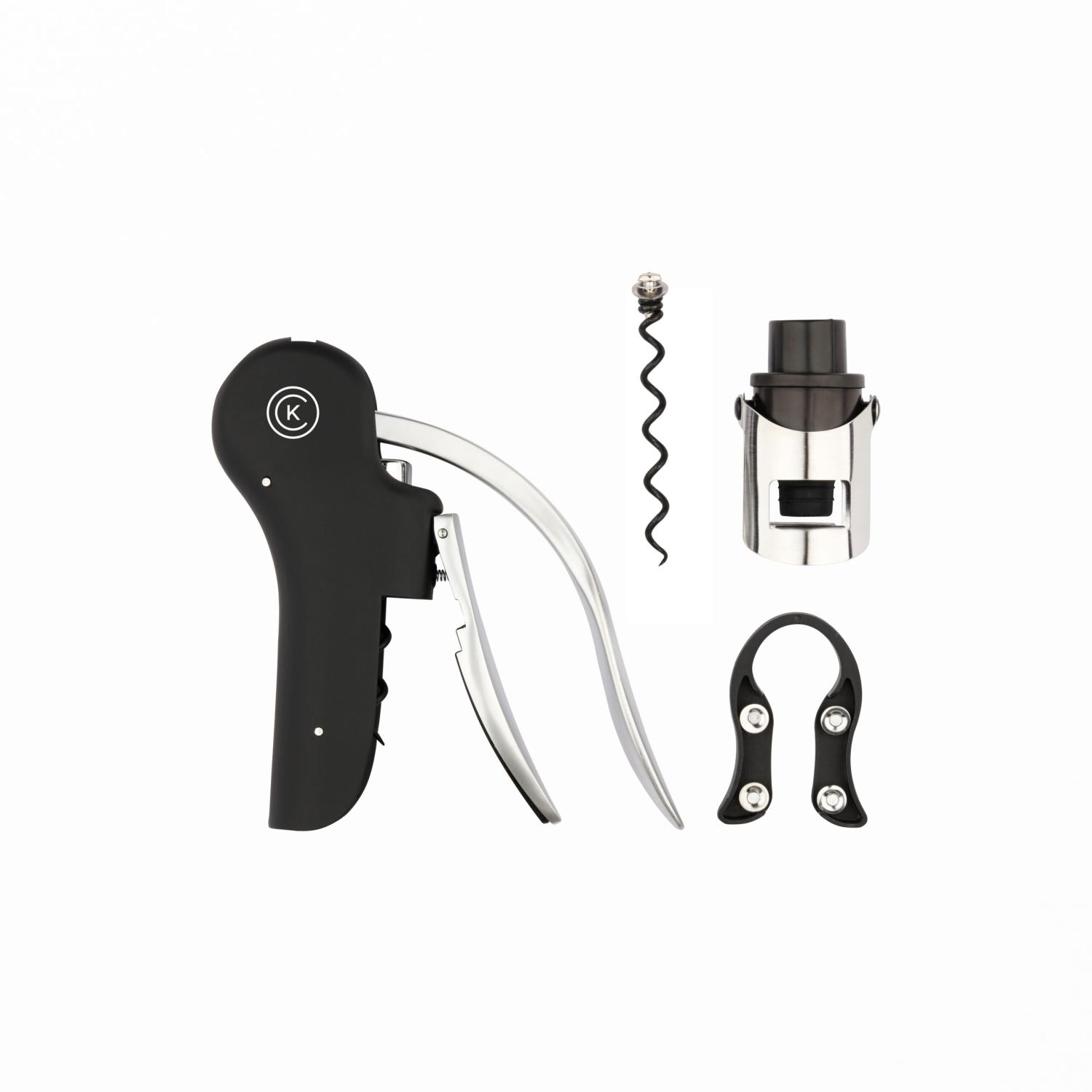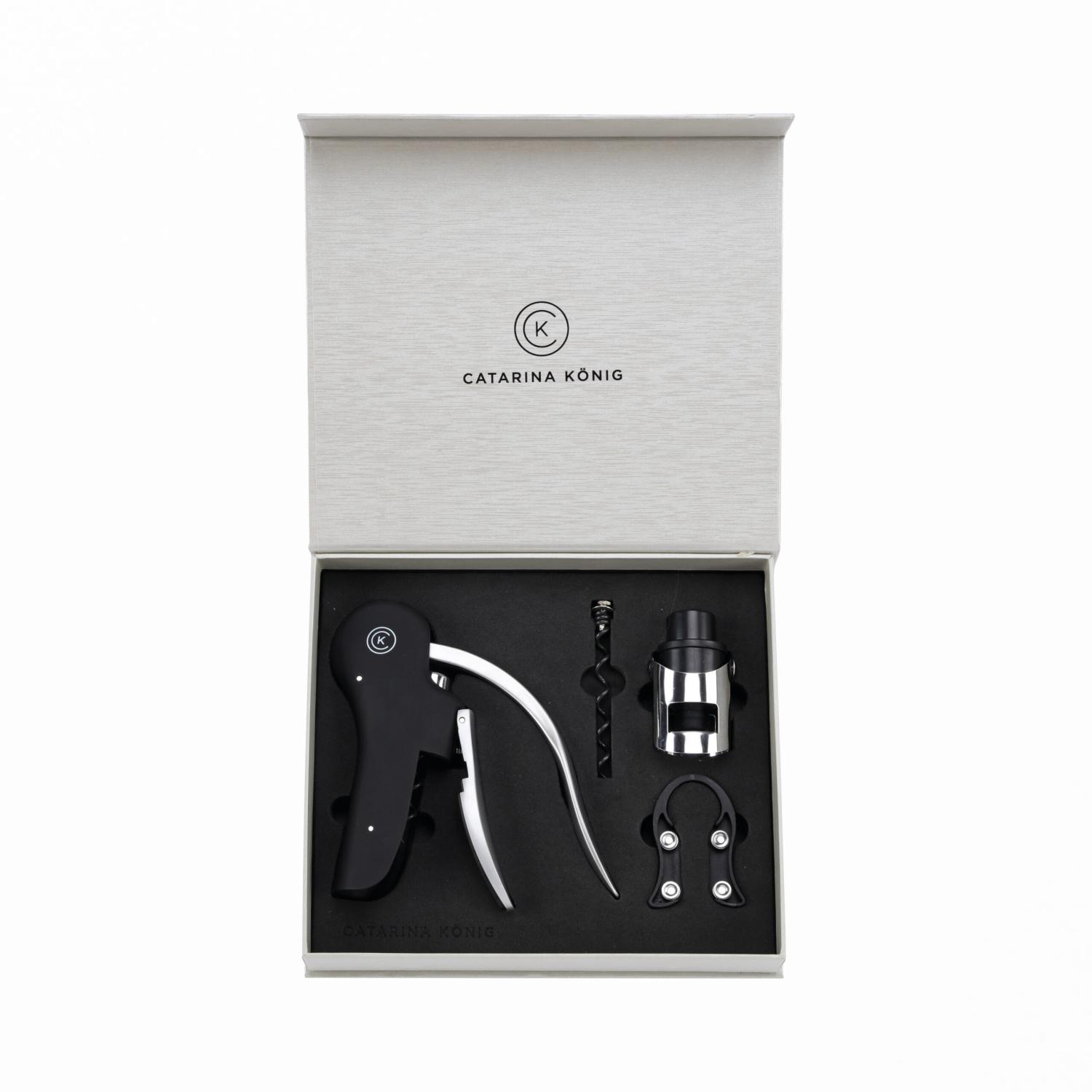 En professionell vinöppnare med hävarm för enkel och smidig öppning av vinflaskor, en utbytbar spiral i robust metall för långvarig användning, en folieskärare som tar bort folien från flaskhalsen med ett lätt tryck samt en champagnestopper som bevarar bubblorna fräscha längre efter öppning. Med detta set är du redo att öppna, servera och njuta varje gång med guldkant. Levereras i en exklusiv presentkartong. Catarina König.