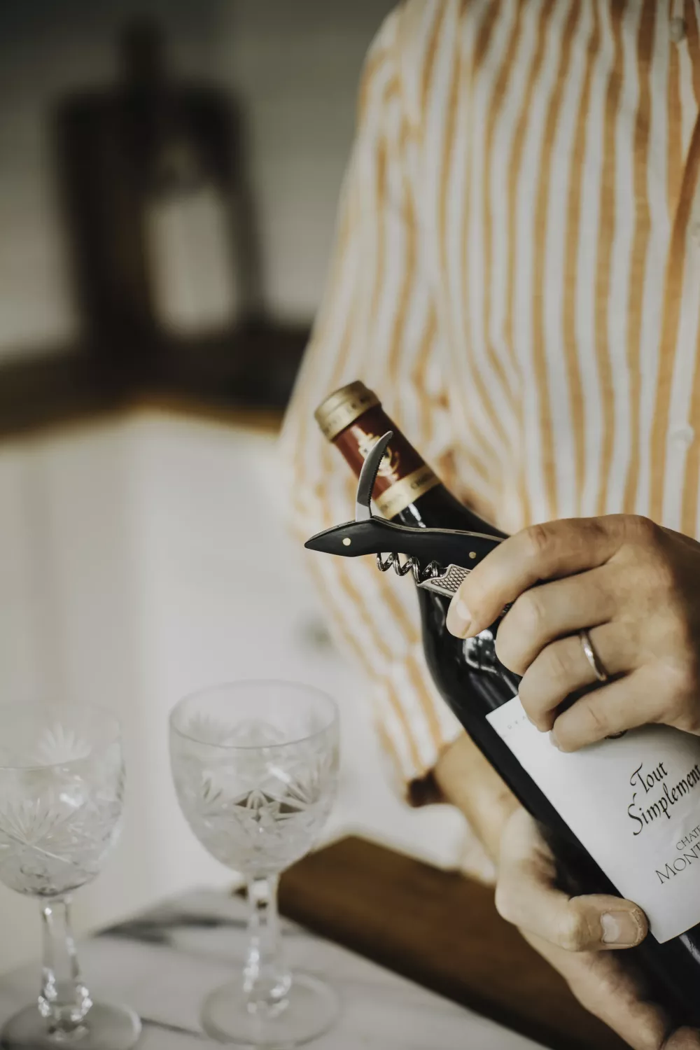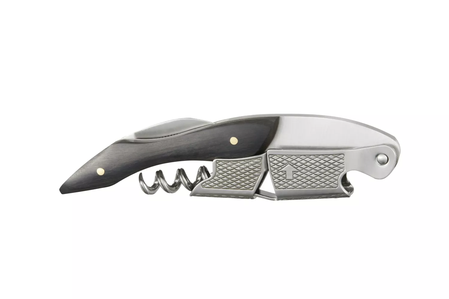 Vinöppnare i trä och rostfritt stål – svart design.