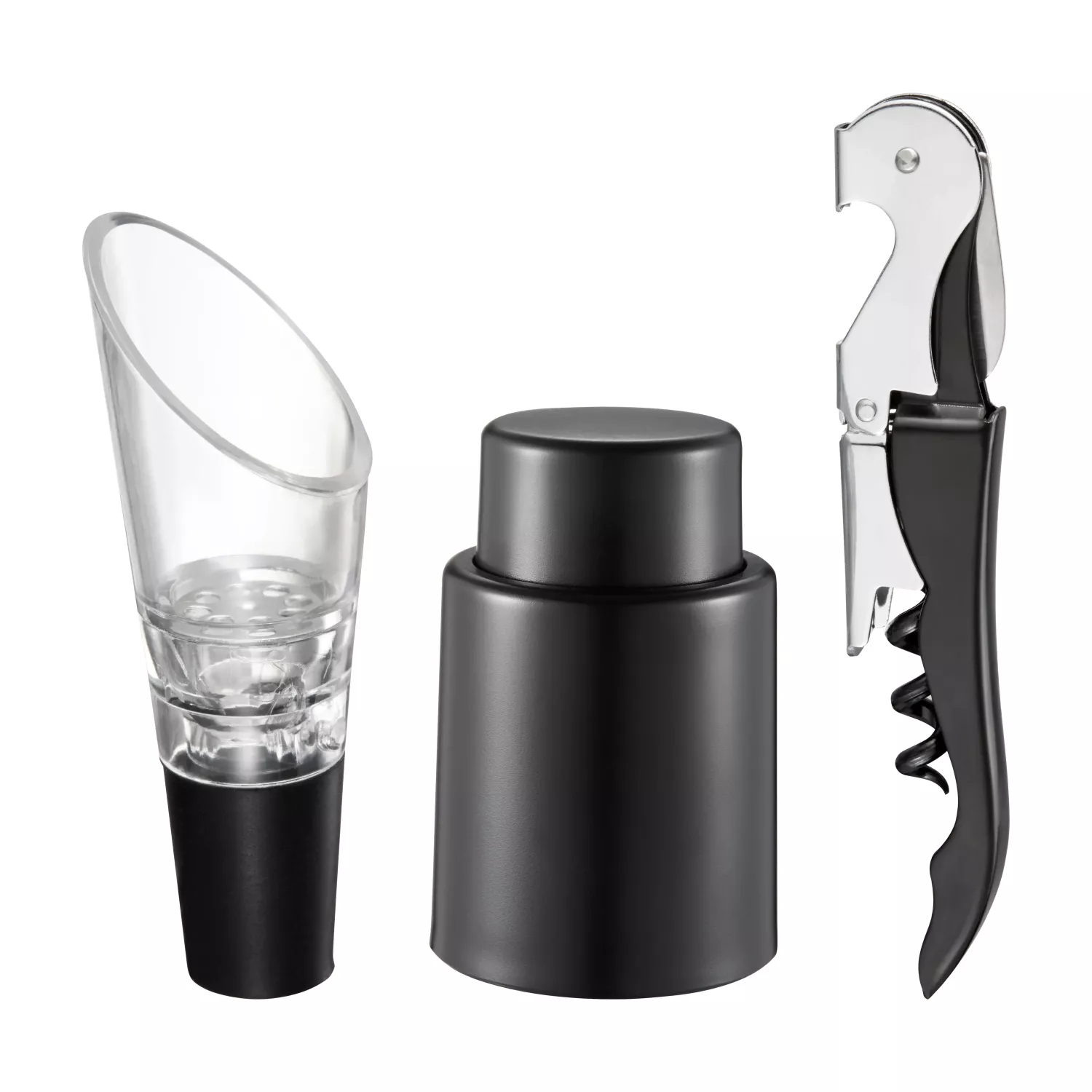 Komplett vinset – öppnare, droppkork och förslutare i presentförpackning.