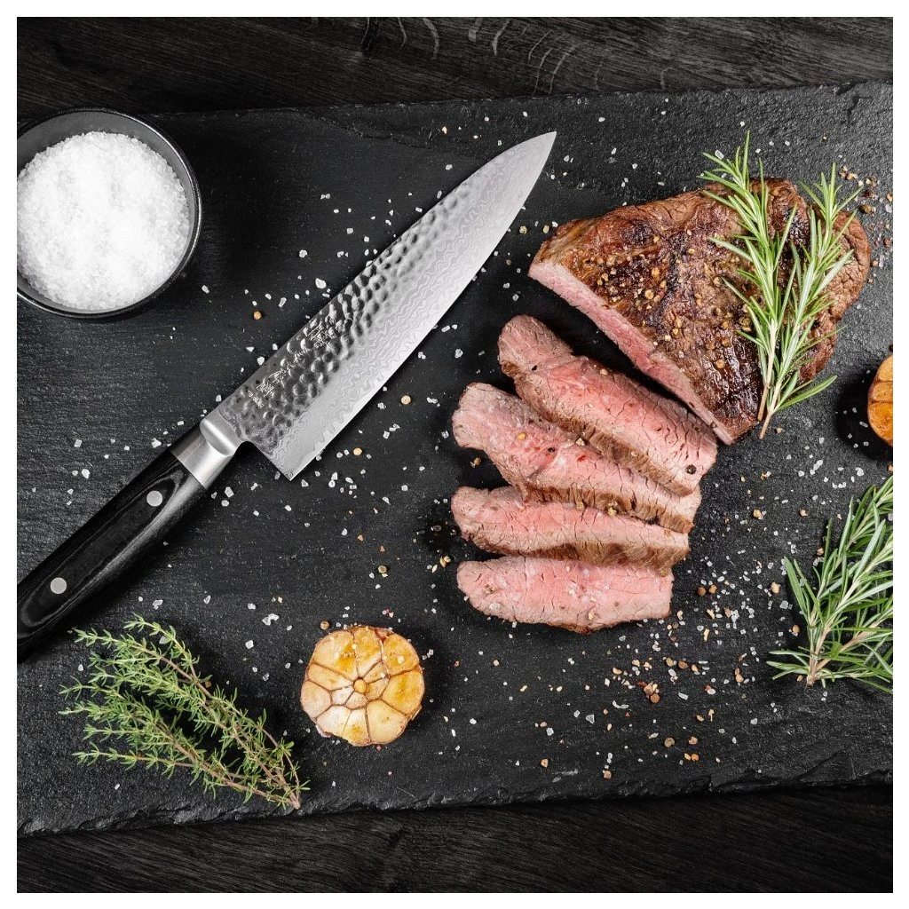 Zen kockkniv 20 cm från Yaxell är en välbalanserad och mångsidig allroundkniv, perfekt för både precisionsarbete och större skärmoment i köket. Den passar utmärkt för kött, fisk och grönsaker.
